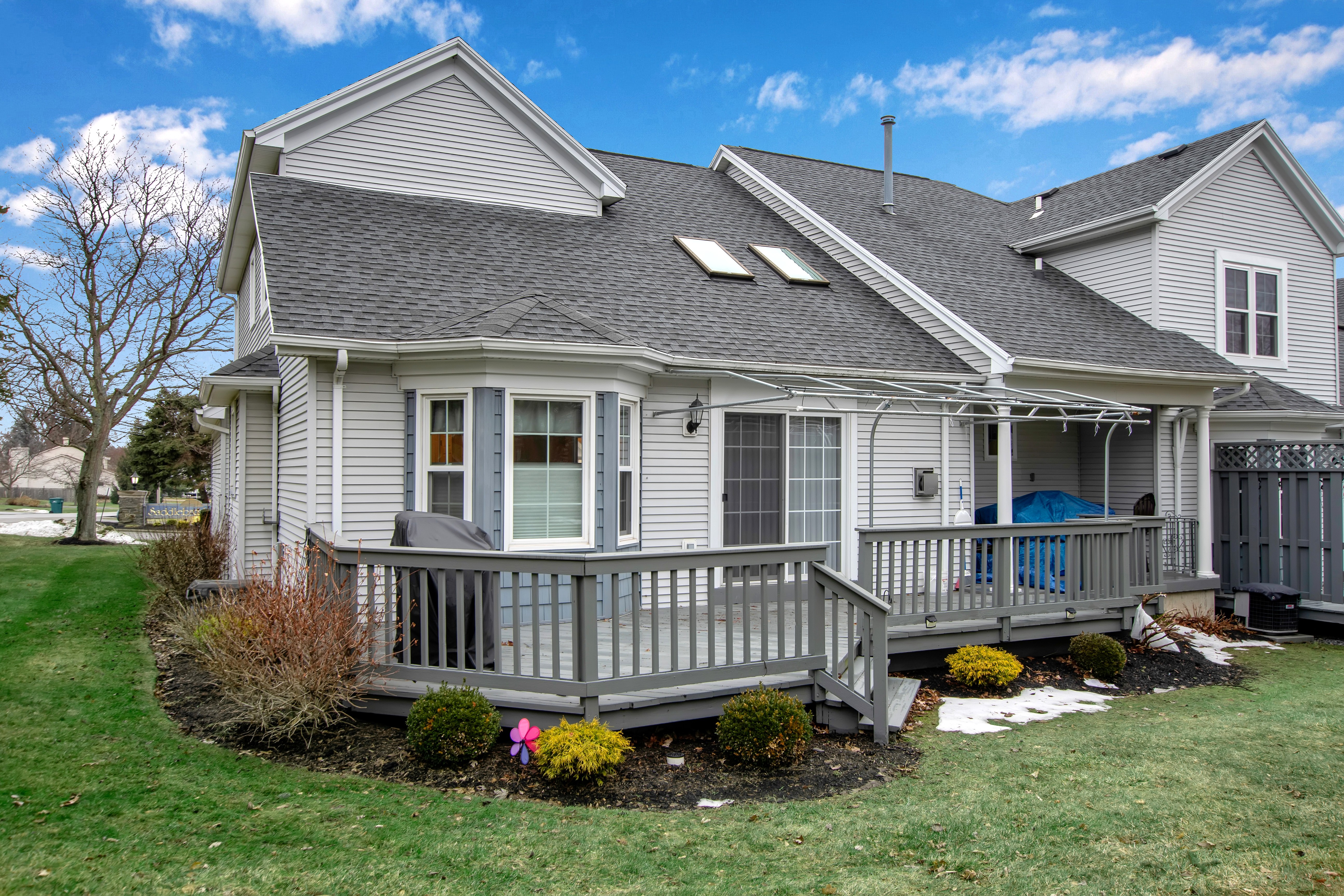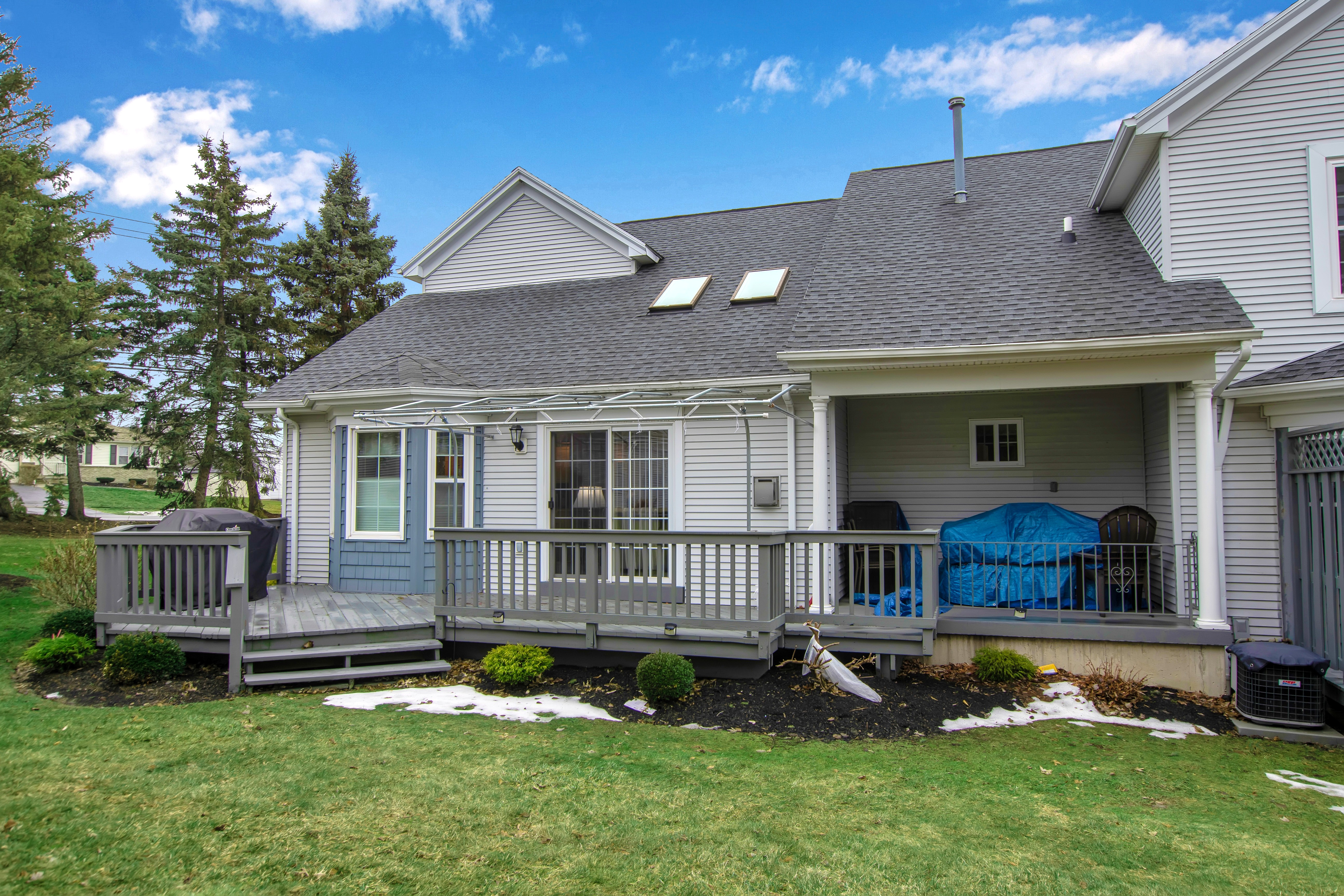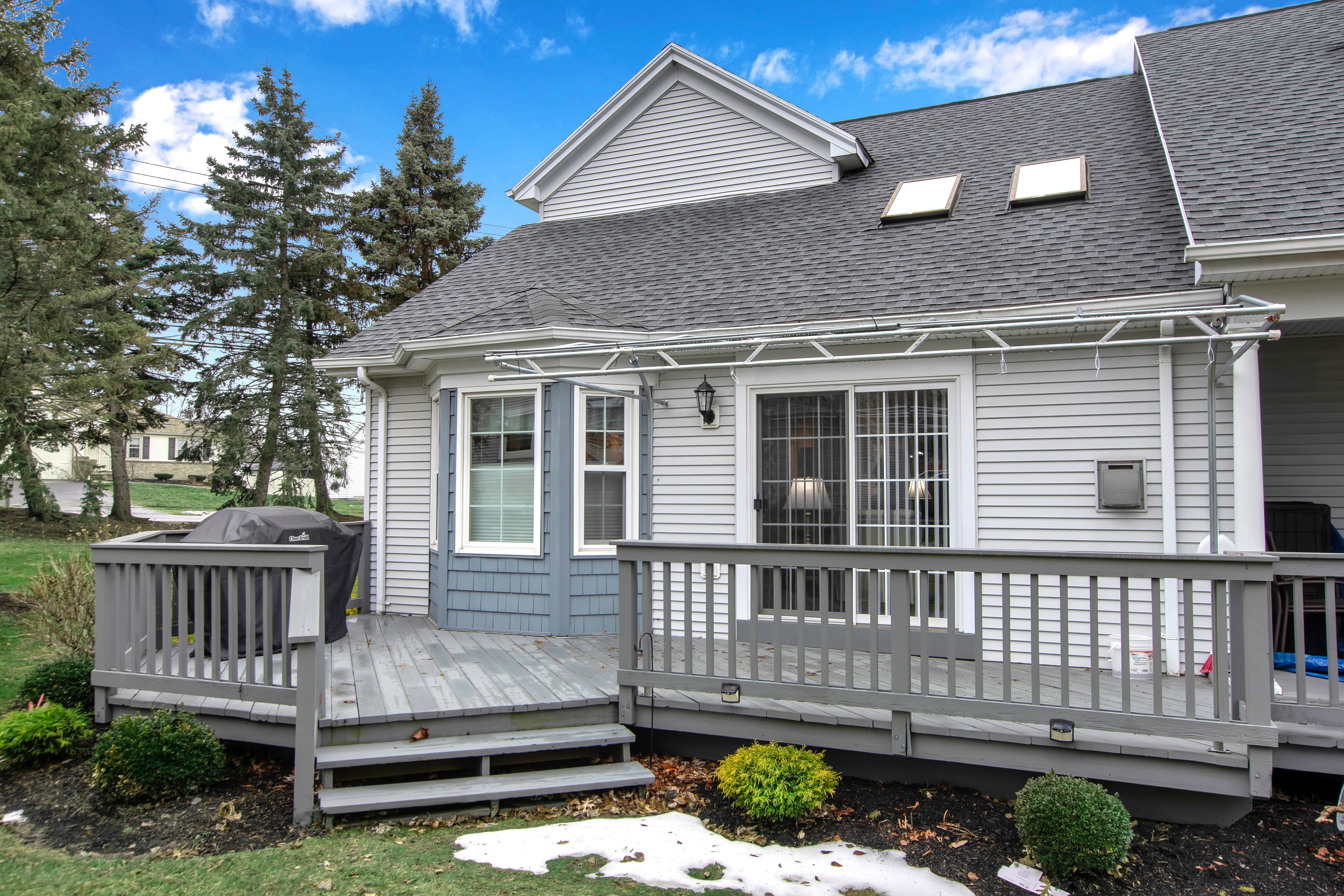 Impressive low maintenance vinyl sided 3 bedroom 2.5 bath townhouse w/attractive backyard deck w/awning has a 1st floor bedroom w/updated full bath, oversized shower, 'California' designed walk-in closet + spacious vanity. The Living Room w/soaring vaulted ceiling w/2 skylights features a gas fireplace, luxury vinyl flooring + sliding door to a backyard deck w/pretty awning. The formal Dining Room w/bay windowed views + pretty chandelier overlooks the bright, sparkling Kitchen w/granite counters, center island, BI dishwasher + microwave, negotiable gas stove + refrigerator. An updated half bath + 1st floor laundry (washer + dryer negotiable) completes the 1st flr plan. The 2nd flr includes 2 spacious bedrooms + updated full bath. The finished basement has a 35 ft berber carpeted room + 16x12 berber carpeted room. Great mechanics: Gas forced air furnace, central air + circuit breakers. Enjoy carefree townhouse living ~ relax on your backyard deck or enjoy fireside views in your Living Room ~ this beautiful townhouse is located close to all conveniences + just too special to miss !