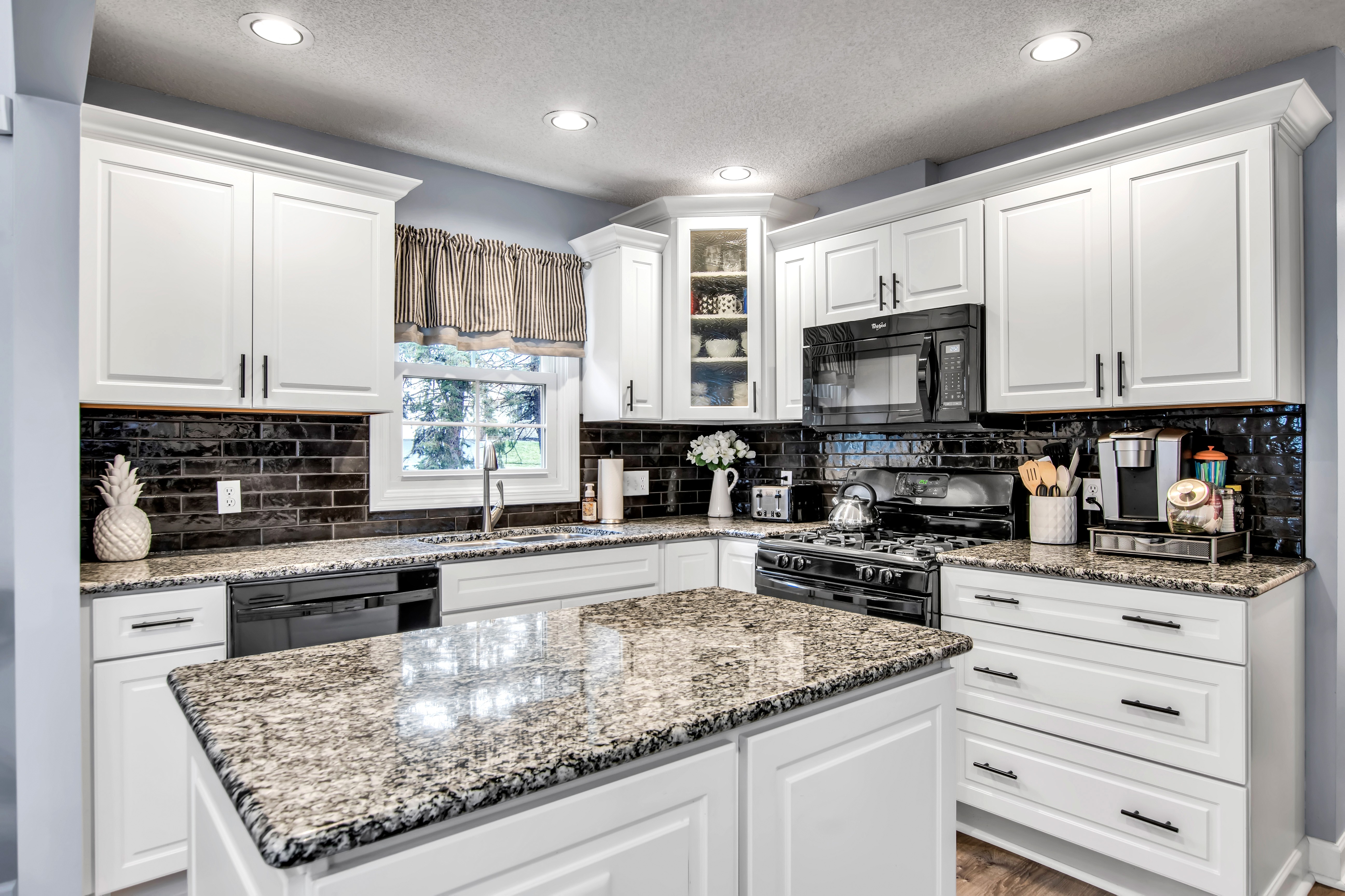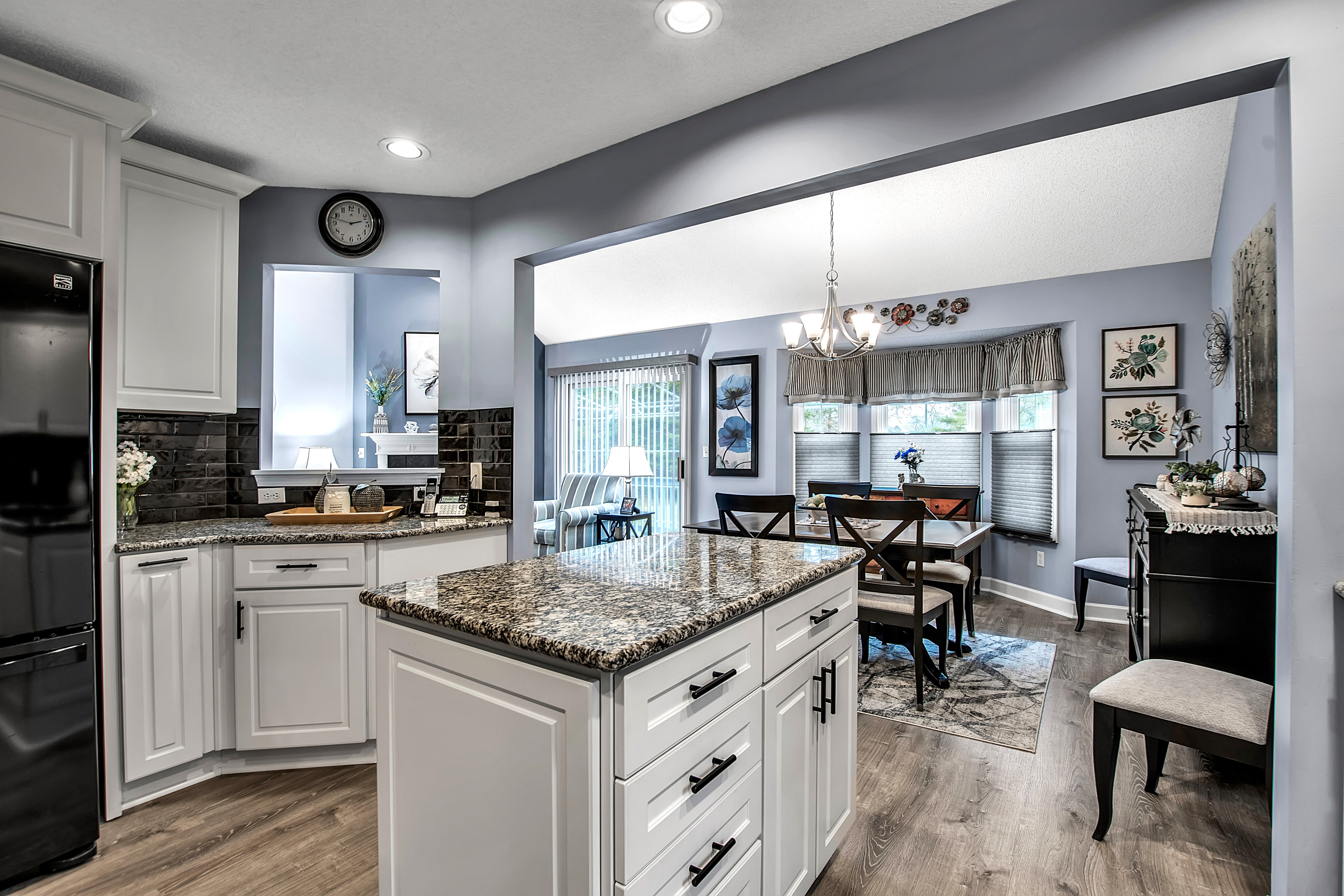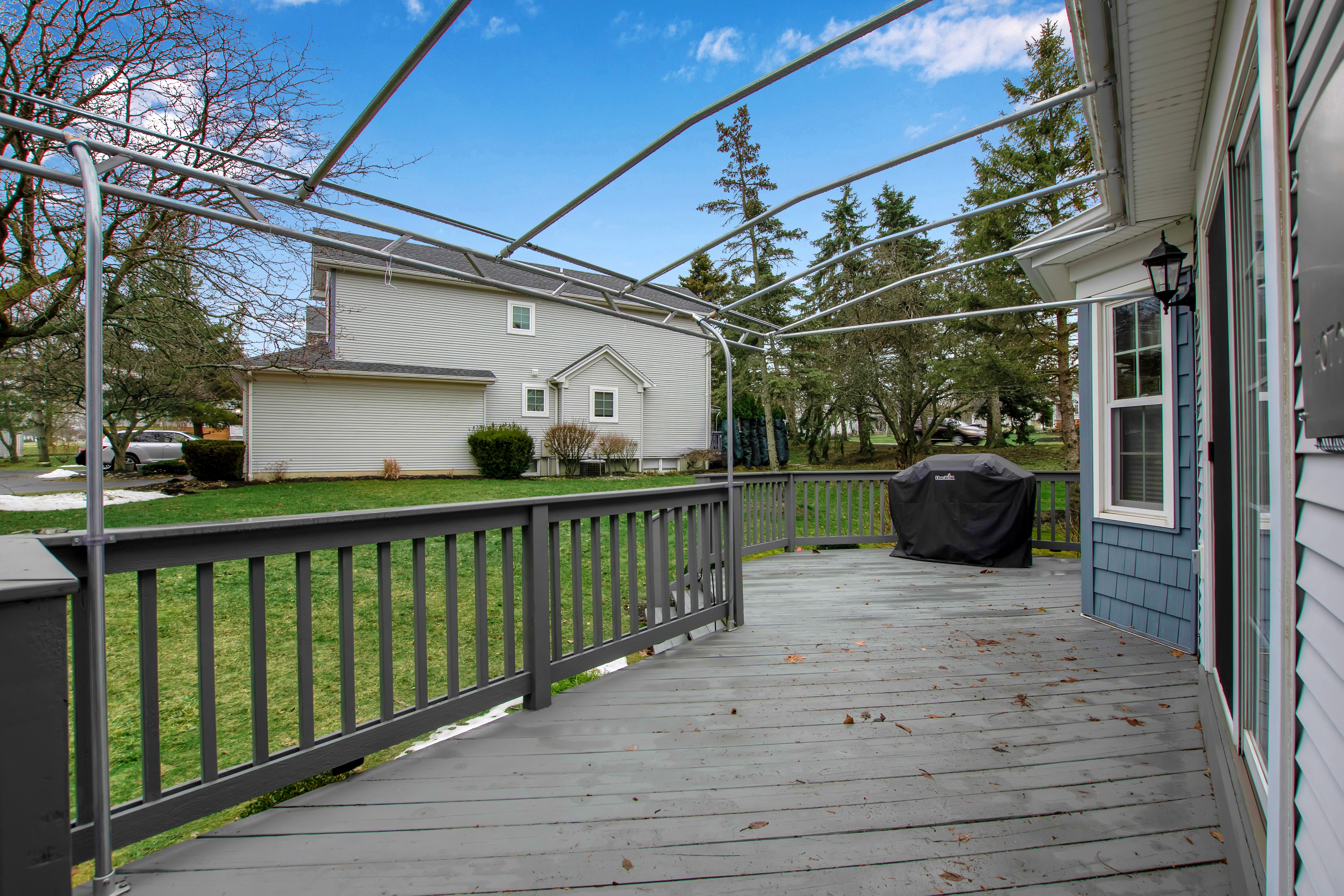 Impressive low maintenance vinyl sided 3 bedroom 2.5 bath townhouse w/attractive backyard deck w/awning has a 1st floor bedroom w/updated full bath, oversized shower, 'California' designed walk-in closet + spacious vanity. The Living Room w/soaring vaulted ceiling w/2 skylights features a gas fireplace, luxury vinyl flooring + sliding door to a backyard deck w/pretty awning. The formal Dining Room w/bay windowed views + pretty chandelier overlooks the bright, sparkling Kitchen w/granite counters, center island, BI dishwasher + microwave, negotiable gas stove + refrigerator. An updated half bath + 1st floor laundry (washer + dryer negotiable) completes the 1st flr plan. The 2nd flr includes 2 spacious bedrooms + updated full bath. The finished basement has a 35 ft berber carpeted room + 16x12 berber carpeted room. Great mechanics: Gas forced air furnace, central air + circuit breakers. Enjoy carefree townhouse living ~ relax on your backyard deck or enjoy fireside views in your Living Room ~ this beautiful townhouse is located close to all conveniences + just too special to miss !