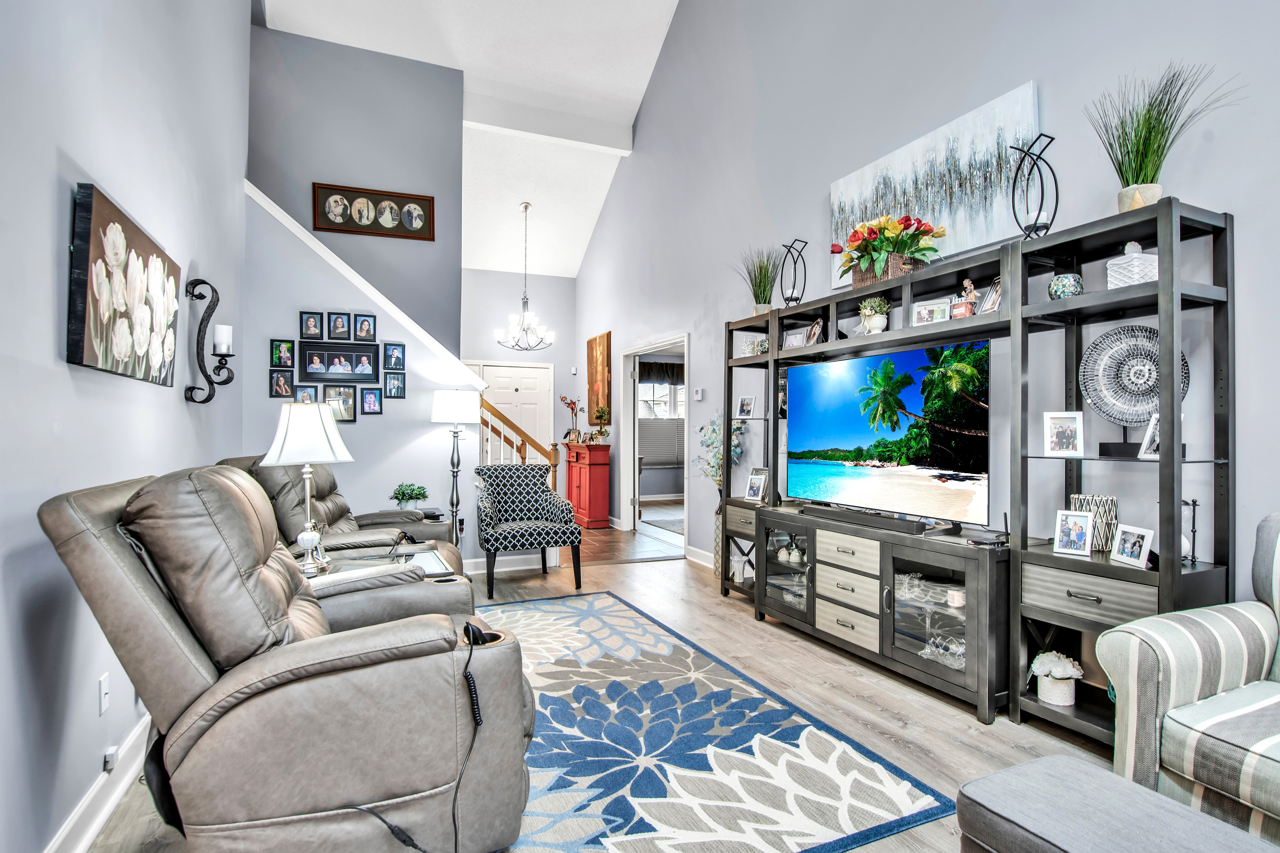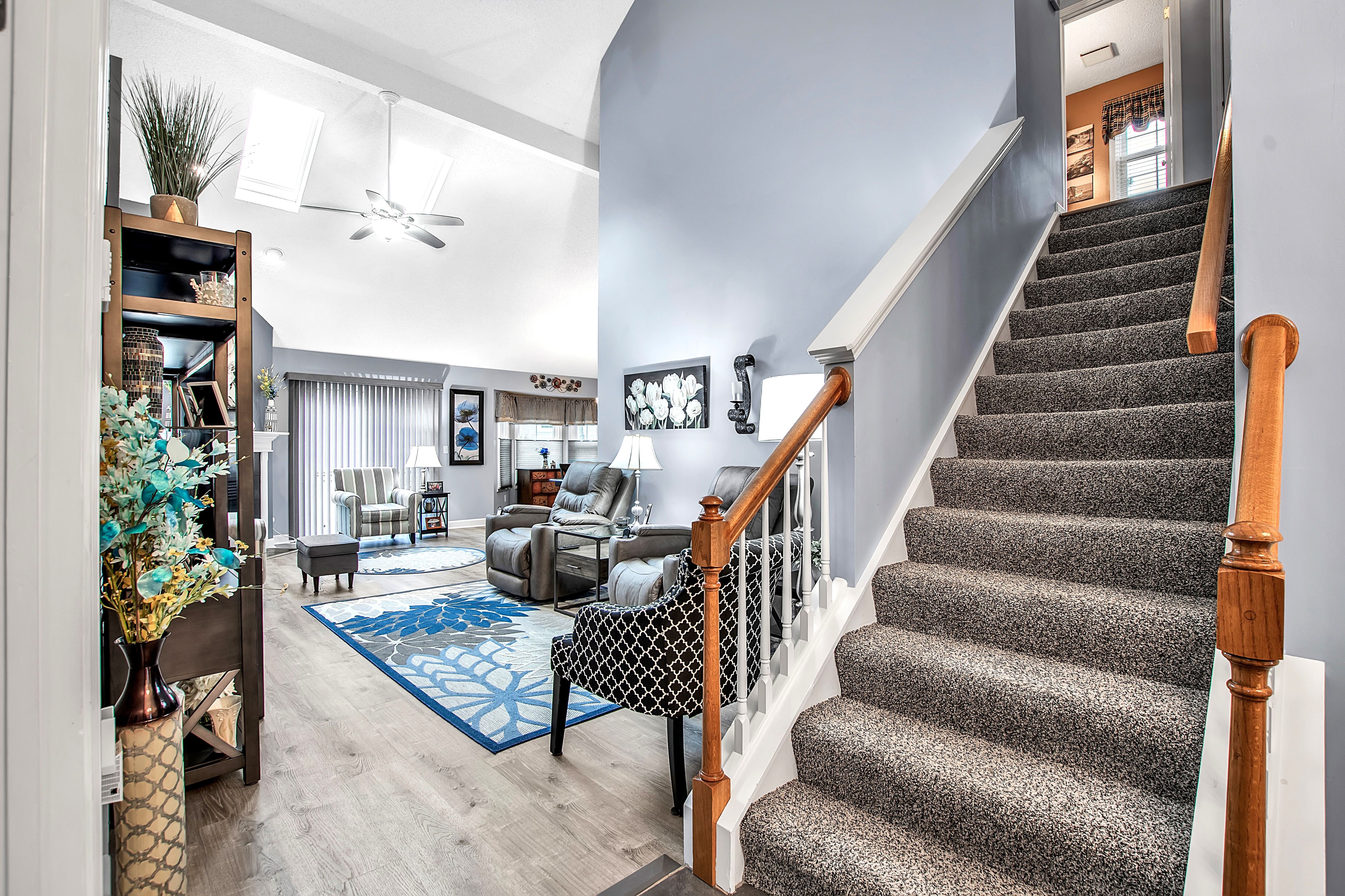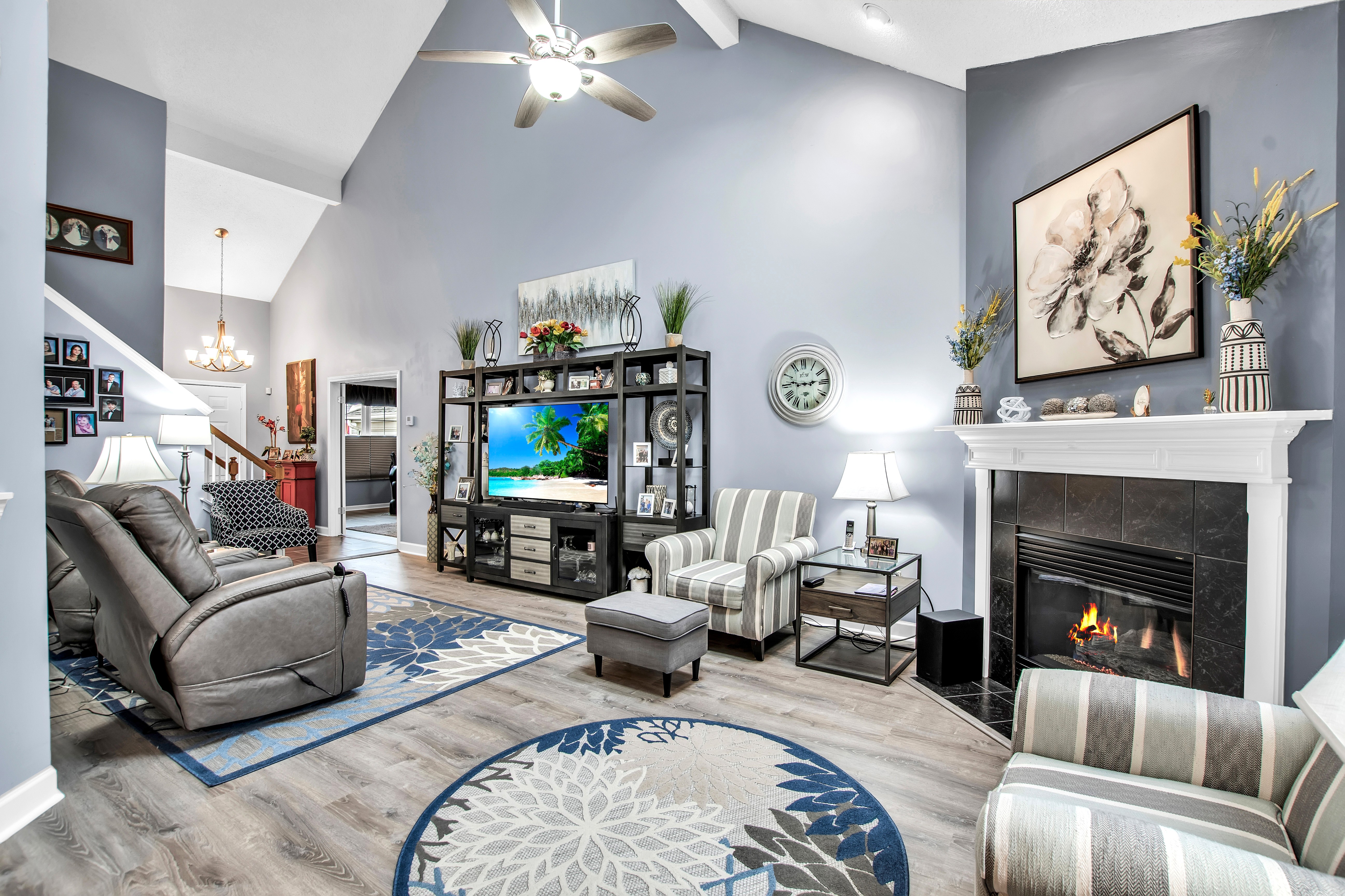 • Living Room w/luxury vinyl floor, gas fireplace + sliding door to backyard deck w/awning