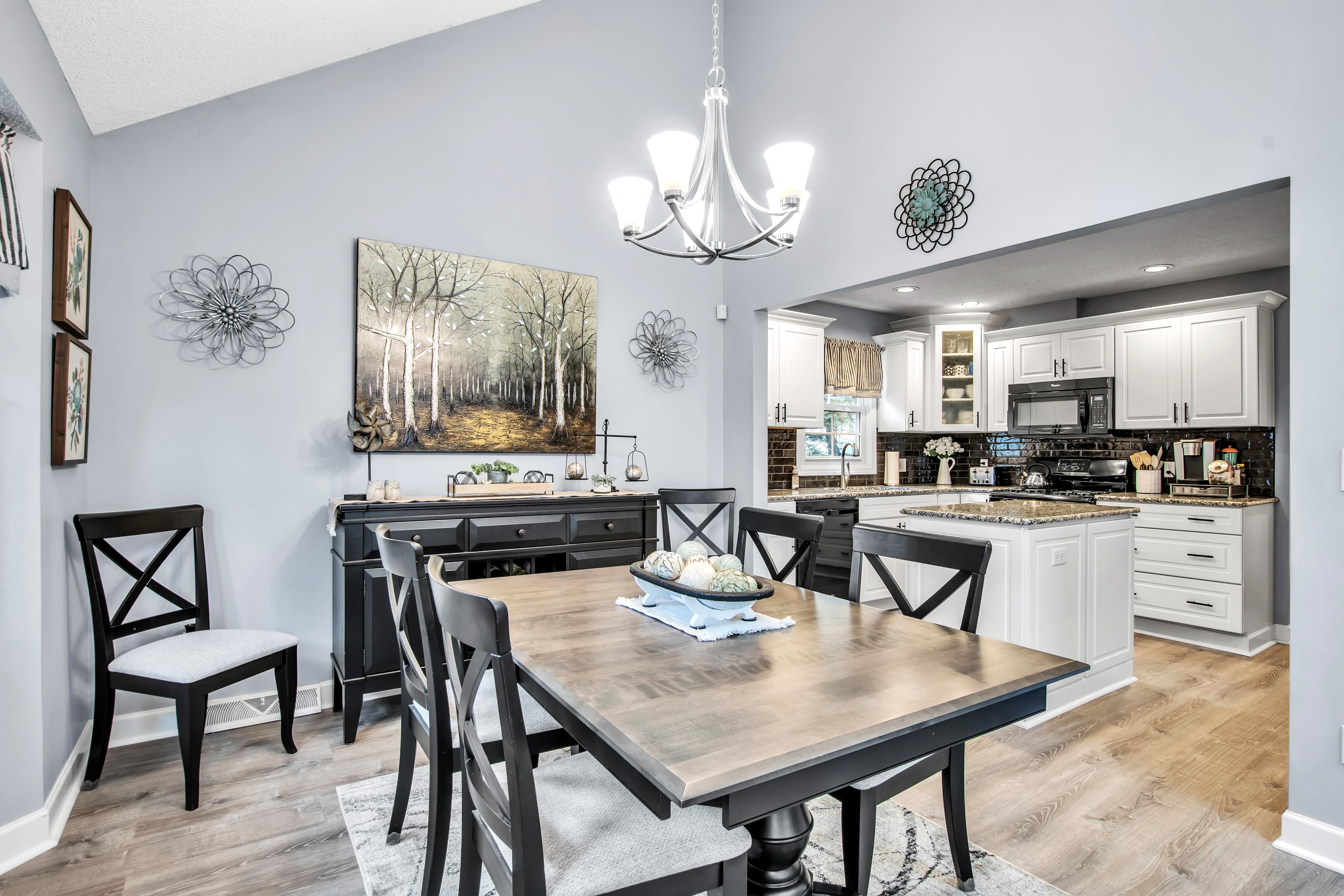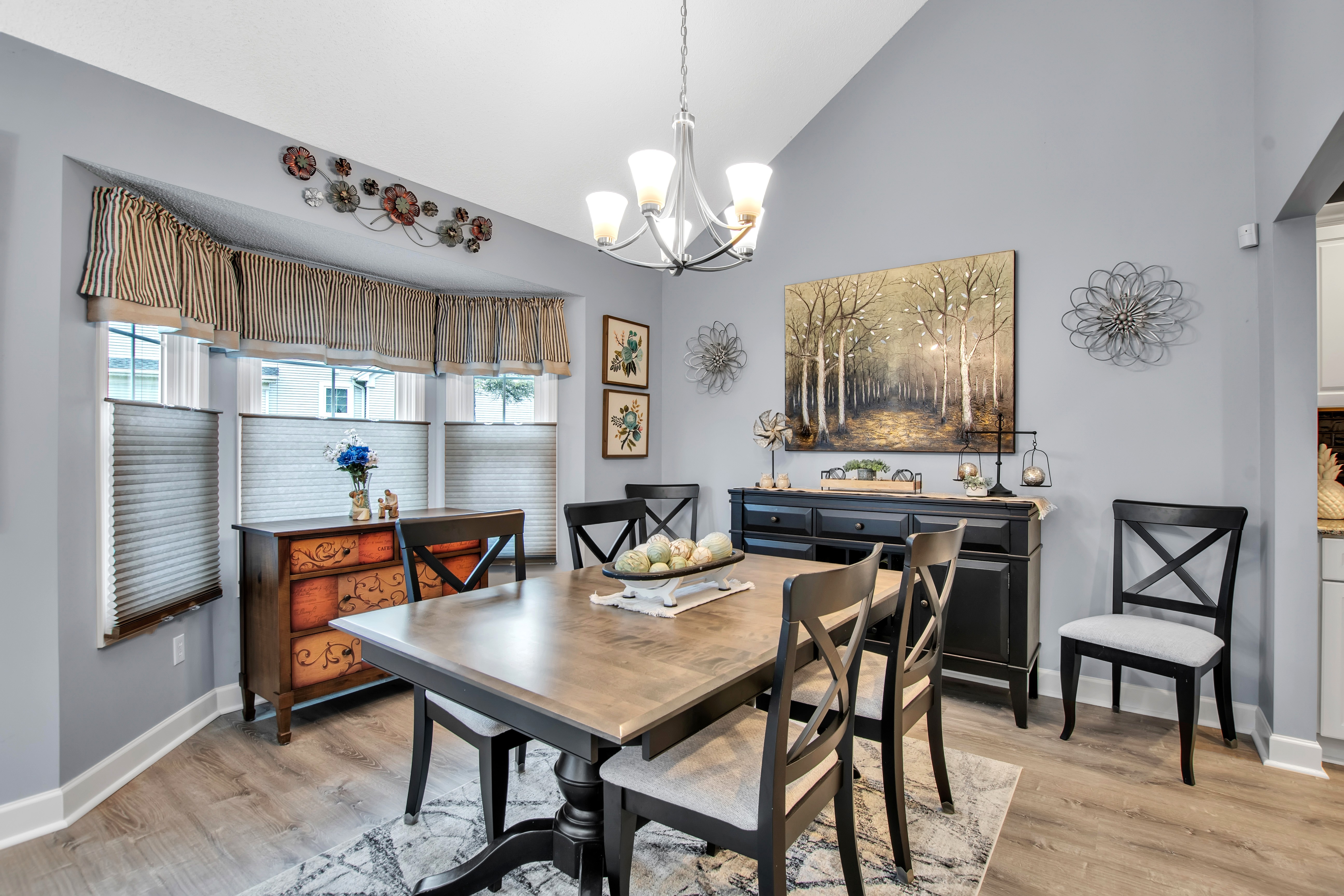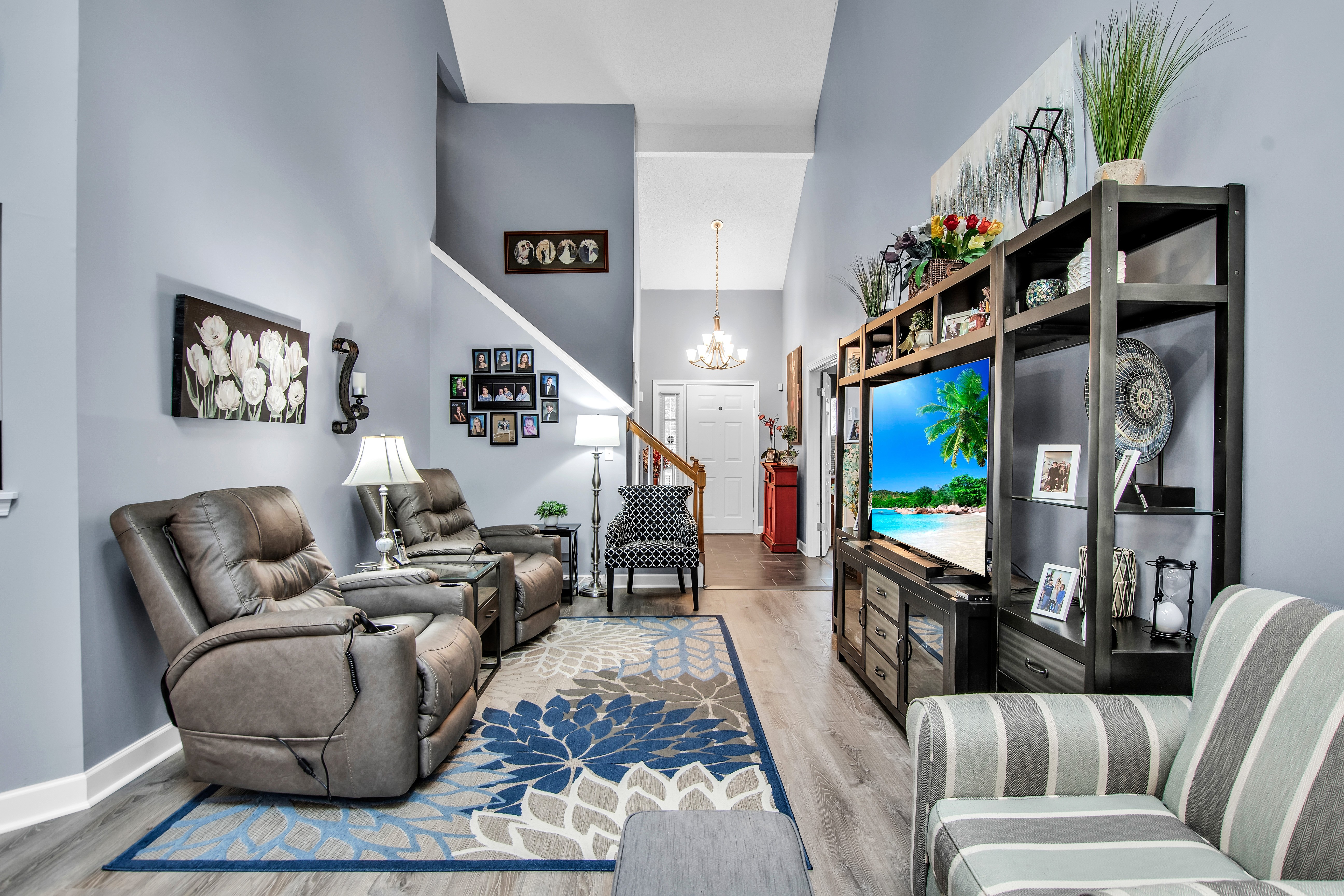 • Living Room w/luxury vinyl floor, gas fireplace + sliding door to backyard deck w/awning